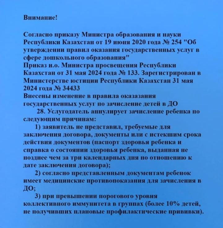 Уважаемые родители, будьте внимательны!!! В случаях представления неполного пакета документов согласно перечню, предусмотренному стандартом государственной услуги, и (или) документов с истекшим сроком действия, то вам будет отказано в приеме заявления.