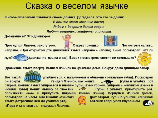 - Прежде чем начать занятия, лучше познакомить ребенка с названиями артикуляционных органов. Такое знакомство лучше провести в форме сказки. В результате ребенок должен усвоить названия органов: зубы, нижняя и верхняя губа, небо, язык.