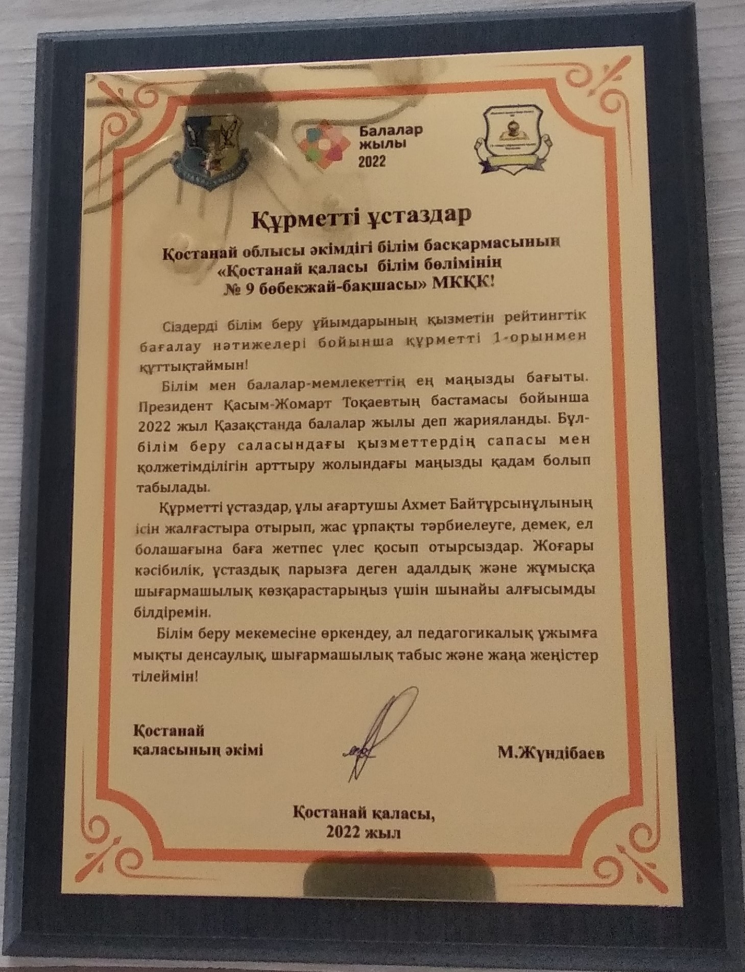 В рейтинге деятельности яслей - садов города Костаная КГКП «Ясли - сад №9» занял 1 призовое место в номинации «Лучшая дошкольная организация», отмечен приветственным адресом акимом города Костаная Жундубаевым М.К., а также вручен Сертификат на сумму 500 000 тенге. Это подтверждает высокий профессиональный уровень каждого педагога нашего дружного коллектива.