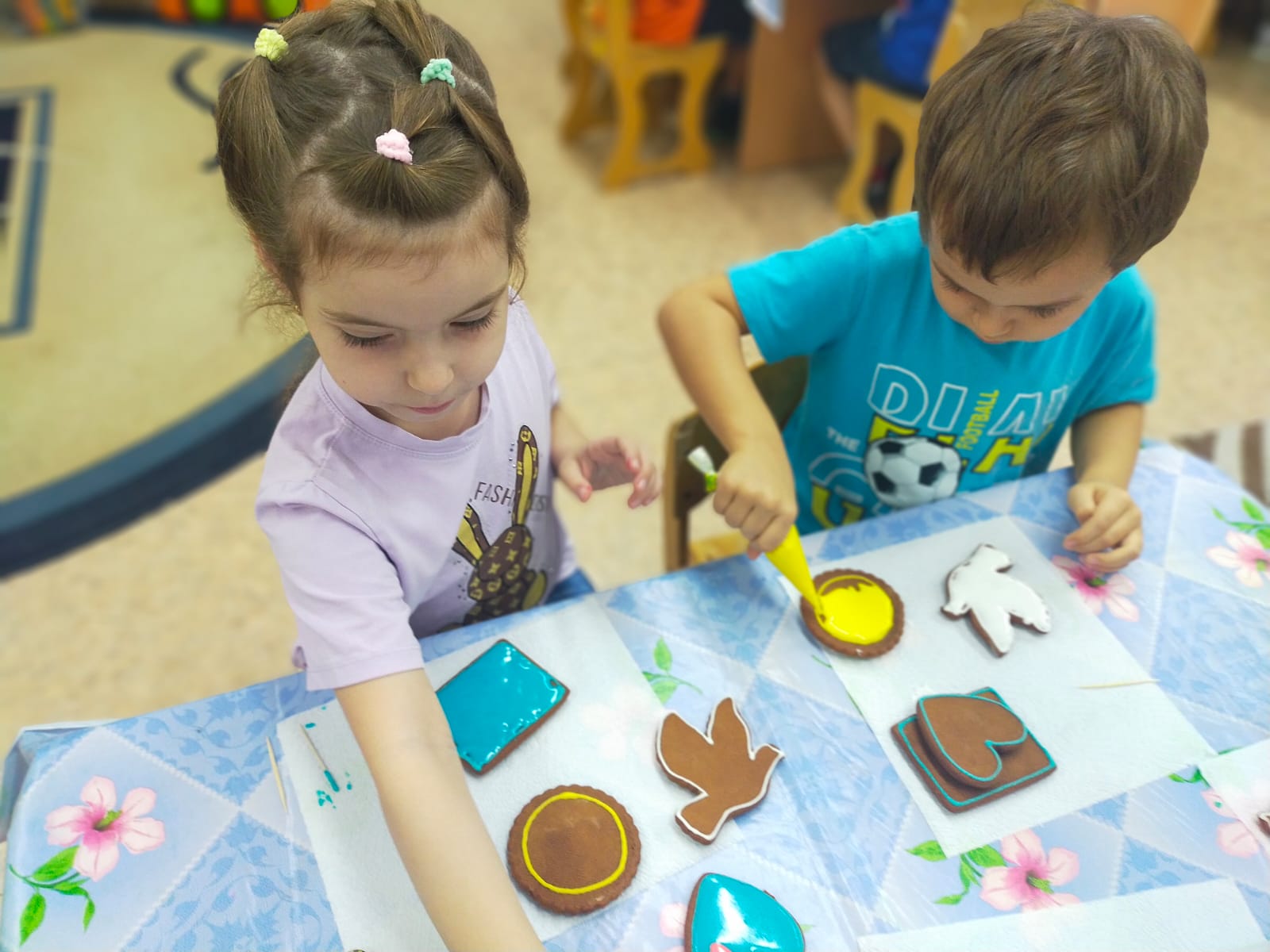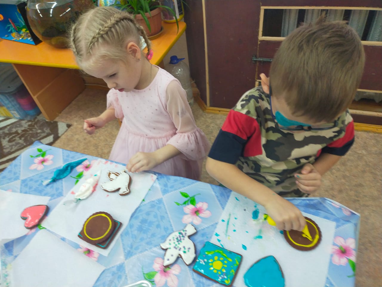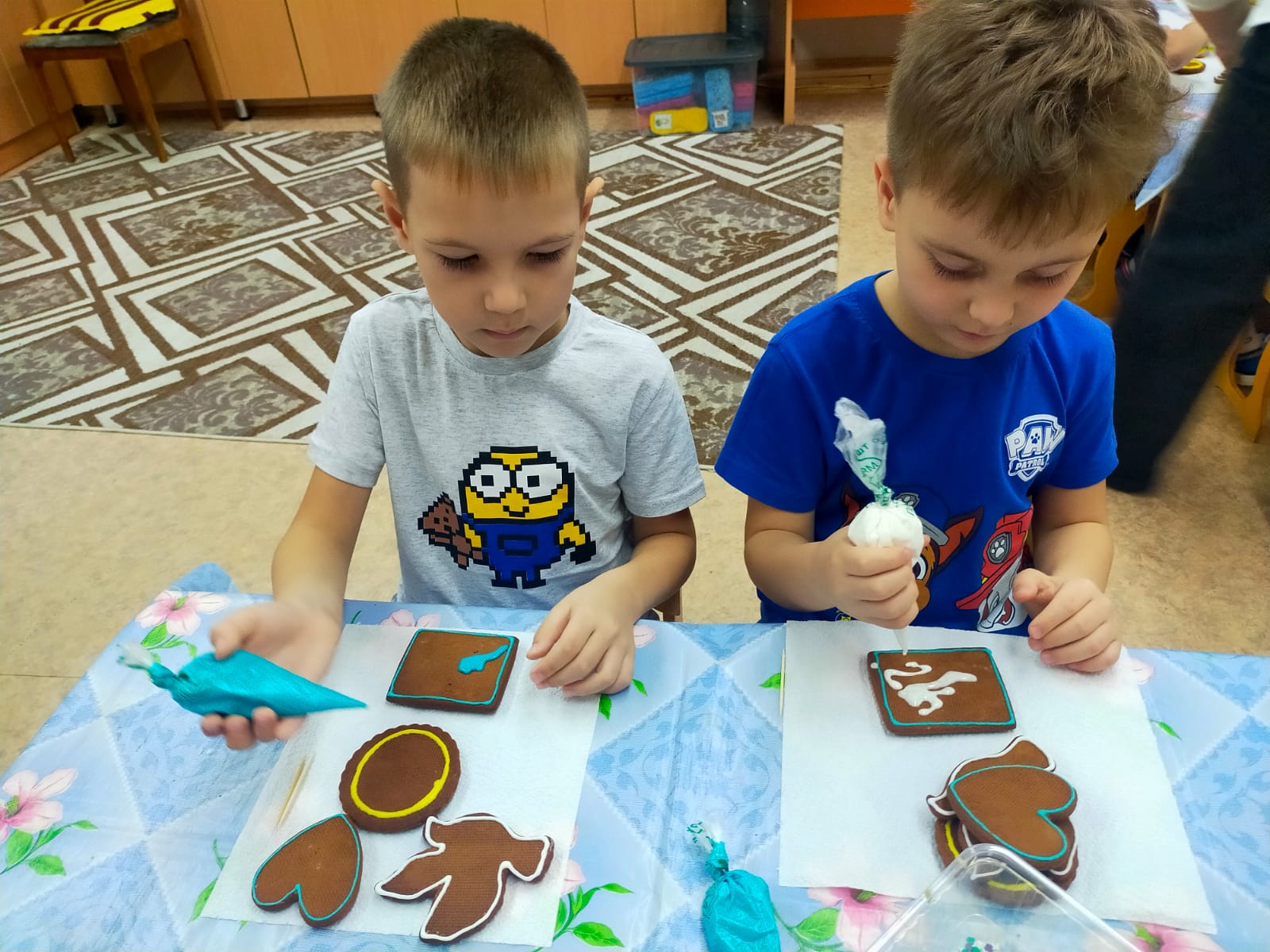 Вначале детям было рассказано о процессе изготовления самого пряника, и о составе сладкой глазури. После этого группа превратилась в мастерскую по росписи. Детям подробно рассказали о последовательности приемов росписи, как подчеркнуть силуэт, сделать прорисовку деталей и заполнить общую поверхность пряника. Ребята с большим энтузиазмом преступили к выполнению работы, каждый из них пытался как можно красивее и интереснее расписать свой пряник, в дополнение, используя украшения и кондитерские посыпки. После работы ребята рассматривали и любовались красивыми, расписными пряниками, которые у них получились. Все участники мастер-класса унесли домой вкусный и красивый подарок, сделанный своими руками чтобы угостить своих родных.