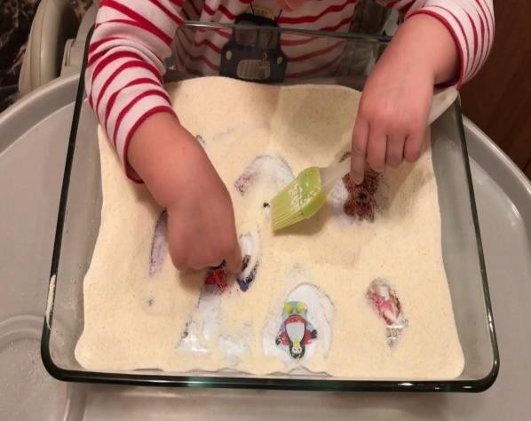 Поднос с манкой организовать проще простого. Совсем кроху можно усадить в стульчик для кормления и насыпать крупу прямо на столик. Ребенка постарше – усадить за стол и насыпать на поднос. По крупе можно водить пальчиками, рисовать, можно делать из нее горы, пересыпать с одного места на другое.