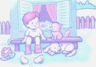 «Внимательно рассмотри картинку». Скажи, кто или что находится справа, перед, за, на и под. Мальчик сидит ? домом. Собака спит ? лавкой. Кошка сидит ? лавочке ? от мальчика. Цветок растет ? от мальчика. Забор находится ? домом.